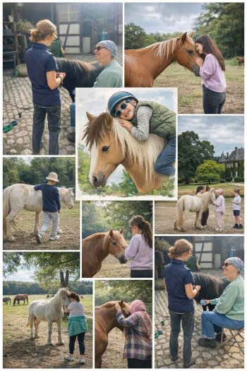 - Interaction douce avec l’animal (pansage, soins, marche à côté du poney…)